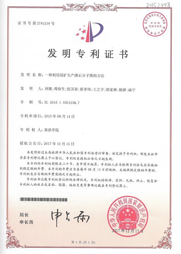 (2)“一种利用尾矿生产沸石分子筛的方法”受让方:陕西宏科绿色建材有限公司