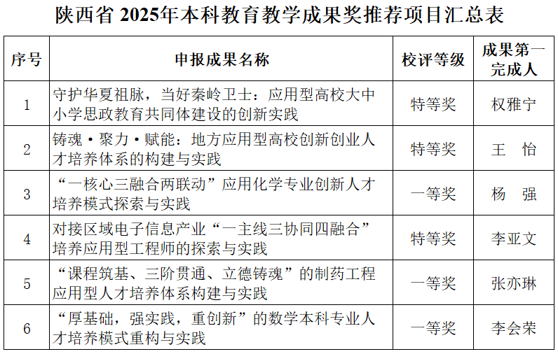 根据《关于开展2025年高等教育教学成果奖评审工作的通知》(陕教函〔2025〕688号)文件精神,best365认真组织开展高等教育教学成果奖申报工作,经各教学单位推荐,校内外专家评审,学校教学工作委员会审定,拟推荐《聚守护华夏祖脉,当好生态卫士:秦岭腹地大中小学思想政治教育一体化建设的创新实践》等6个项目(见下表)申报2025年陕西省高等教育教学成果奖,现予以公示。