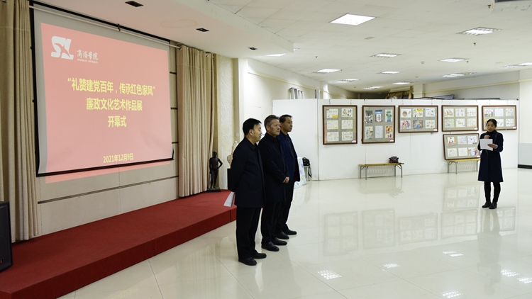 12月9日上午,由校纪委主办、艺术学院承办的“礼赞建党百年,传承红色家风”廉政文化艺术作品展在北新街校区图书馆五楼艺术展厅开幕。校党委书记张志昌,党委副书记彭虎军,副校长王新军、刘宝盈出席开幕式并参观作品展。各职能部门负责人、二级学院(部)党政负责人以及艺术学院师生代表参加了开幕式。开幕式由纪委副书记田小莉主持。