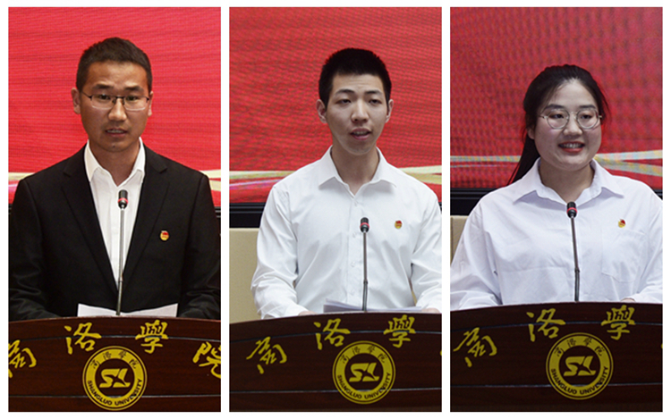 获奖集体和个人代表,建工学院团总支书记杜江涛、生物学院制药工程专业1902班学生李丹、数计学院计算机科学与技术专业2001班学生叶辅军分别做了表态发言。他们代表全体团学工作人员和青年学生表示,将勇于担当青年责任,努力成长成才,助力学校建设发展。
