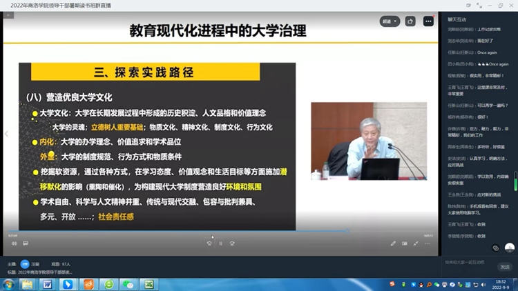 在为期两天的学习中,全体学员集中观看了“推动新时代高校哲学社会科学高质量发展”“中美关系”“深化战略合作共谋人才发展携手开创校地合作共赢新局面”“教育现代化进程中的大学治理”“5G全媒体时代应急管理十奥论引导新形势新战略新实践”等专题讲座。通过实时在线的方式开展交流互动,分享学习心得体会。全体学员认真收看讲座,积极踊跃发言,结合个人工作实际梳理当前工作重点,交流对学习和工作的谋划与思考,共产生话题讨论消息数627条,从思想观念、工作思路、工作定位、工作作风等多个方面,推动党员干部政治素质和各方面工作能力提升。