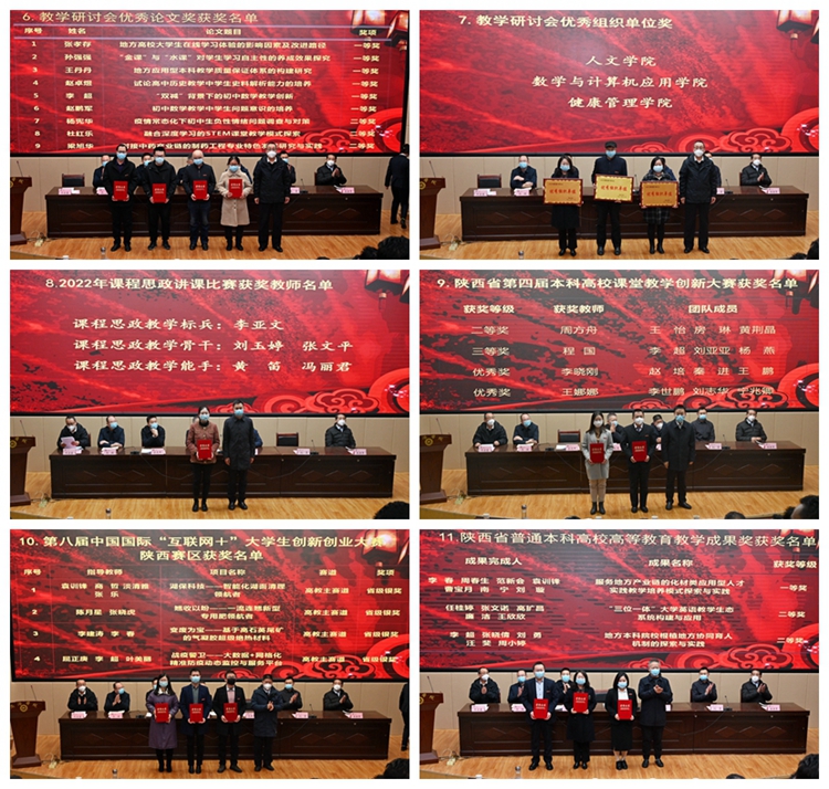 大会对best3652022年度优秀教案、优秀电子课件获奖教师,优秀实习指导教师、优秀毕业论文指导教师,校级教育教学成果奖、校级一流课程、教育教学研讨会优秀论文、优秀组织单位、校级课程思政讲课比赛获奖教师、陕西省第四届本科高校课堂教学创新大赛获奖教师、第八届中国国际“互联网+”大学生创新创业大赛指导教师、陕西省普通本科高校高等教育教学成果奖获奖教师进行了表彰。出席大会的校领导为受表彰的集体和个人颁发了证书。