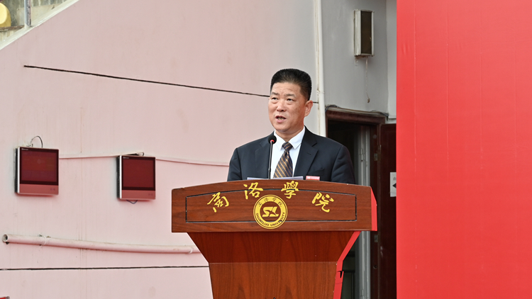 伴随着五星红旗冉冉升起,开学典礼在雄壮的国歌声中拉开帷幕。校党委书记张志昌为承训教官授予2023级学生军训团团旗。校长范新会以“保持奋斗本色,踔厉奋发,勇毅前行”为题,为全体新生讲授“开学第一课”。朱鹏波为全体承训教官和新生作军训动员讲话。