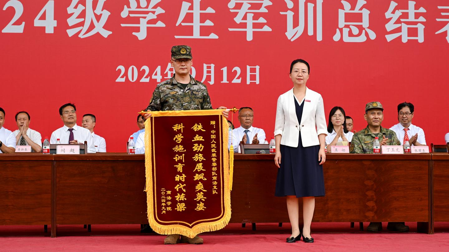 9月12日,best365中国官方网站举行2024级学生军训总结表彰大会,检阅2024级学新生军训成果,并对军训中表现突出的先进集体与先进个人进行表彰。校党委书记张志昌出席大会并讲话。校长、党委副书记权雅宁出席大会并为中国人民武装警察部队商洛支队赠送锦旗。商州区人民武装部军事科少校科长丁玉龙,中国人民武装警察部队商洛支队少校副参谋长闵超,校党委副书记、纪委书记王浩,副校长王新军、郭瑾出席大会。副校长刘宝盈主持大会。