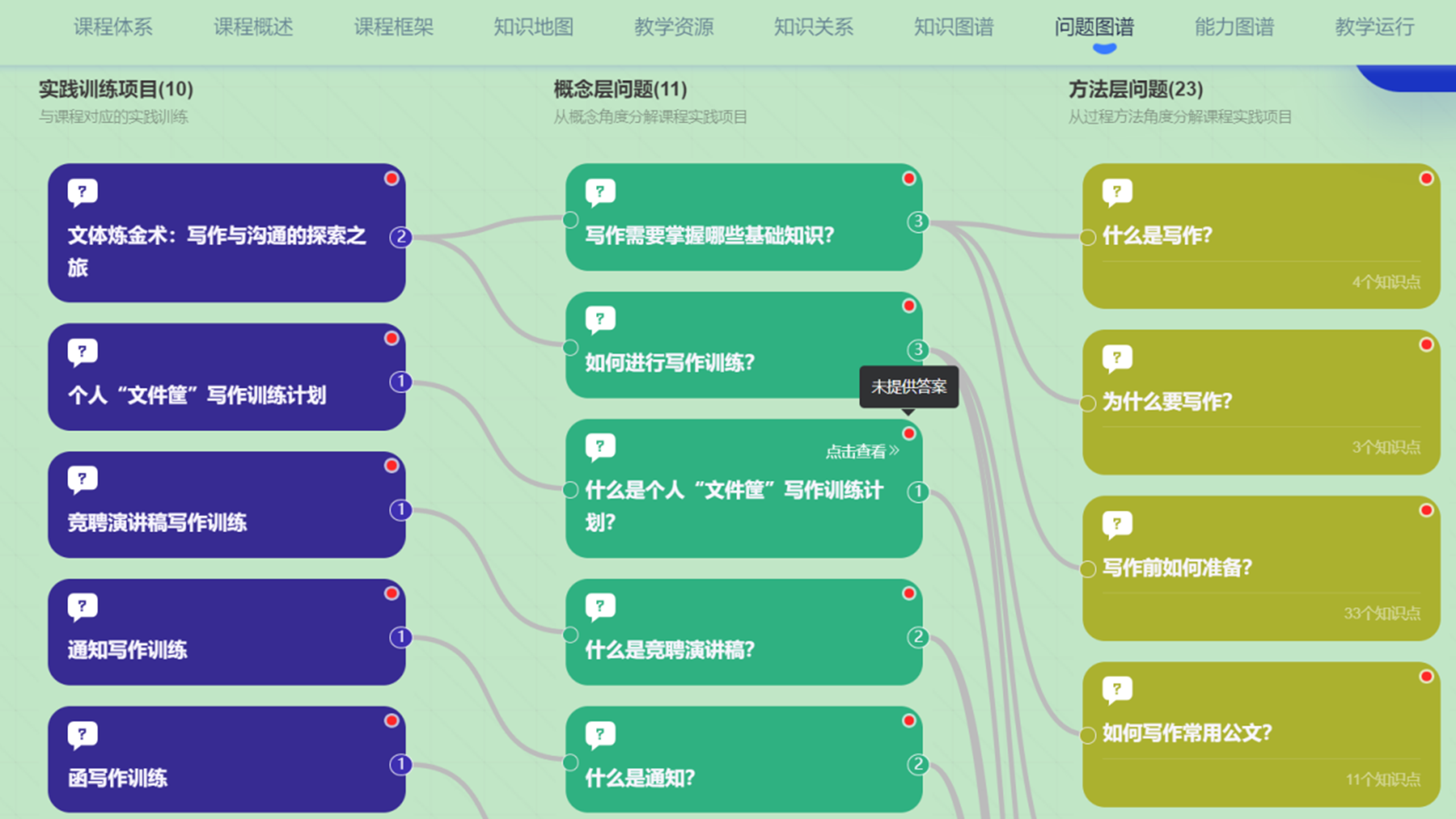 与传统的视频课程资源建设相比,知识图谱课程更加智慧化、数智化,将可视化的课程体系呈现给师生,帮助教师在教学中更好地服务学生。课程采用工作情景模拟和角色意识提升的方法,将写作理论置于实际情境中,以沟通为写作核心,设计具有挑战性的任务和项目,凸显课程两大特点:学法创新——写作“文件筐”训练法强化学生自我管理;成果导向——加深学生学习过程体验,提升其写作能力与沟通能力。同时,引入教育教学AI,将现有的课程资源进行碎片化再利用,给学生更多的学习资源选择和路径选择。学生可基于知识点及关键词,使用AI检索教学资源;教师可利用AI技术,分析学生的学习行为和学习结果,综合判断学生对知识点的掌握度,更加精准地掌握学情,实现更好地“备学生”。