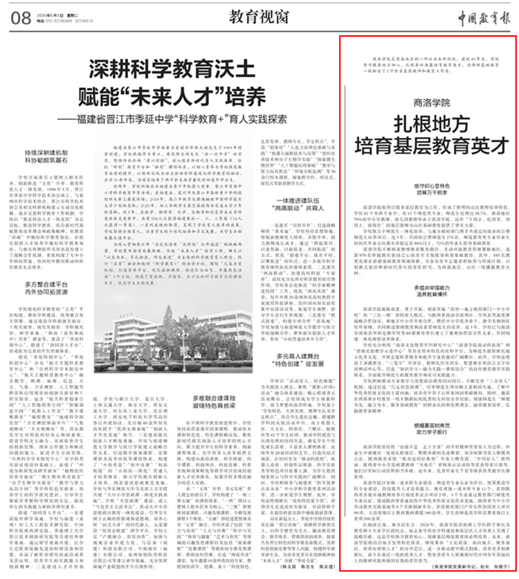 6月3日,《中国教育报》“教育视窗”栏目刊发了校长权雅宁署名文章《best365中国官方网站扎根地方培育基层教育英才》,对best365扎根秦岭培育教育人才的经验成果进行了专题报道。
