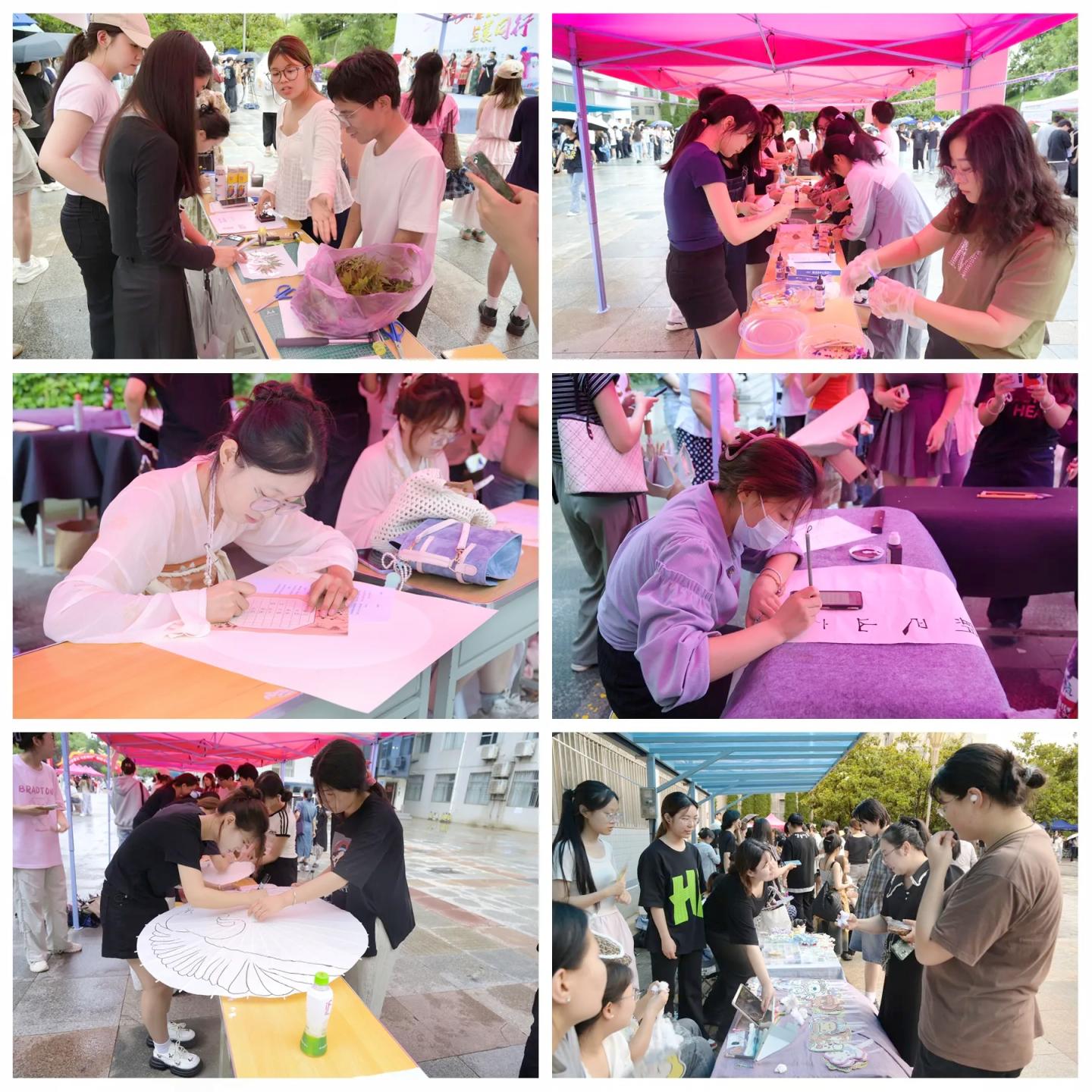 在游园活动中,师生沉浸式参与“霓裳·重光”古装造型赛、“诗海竞帆”诗词擂台赛、“笔竞风华”书法擂台赛、“指尖生花”创意彩绘、“艺展芳华”美育趣味体验、“艺心雅趣”文创市集、“镜观万象”校园影像大赛、油画写生展、中国画写生展等体验项目,各种活动奇妙交融,游园现场人潮如织、气氛热烈。