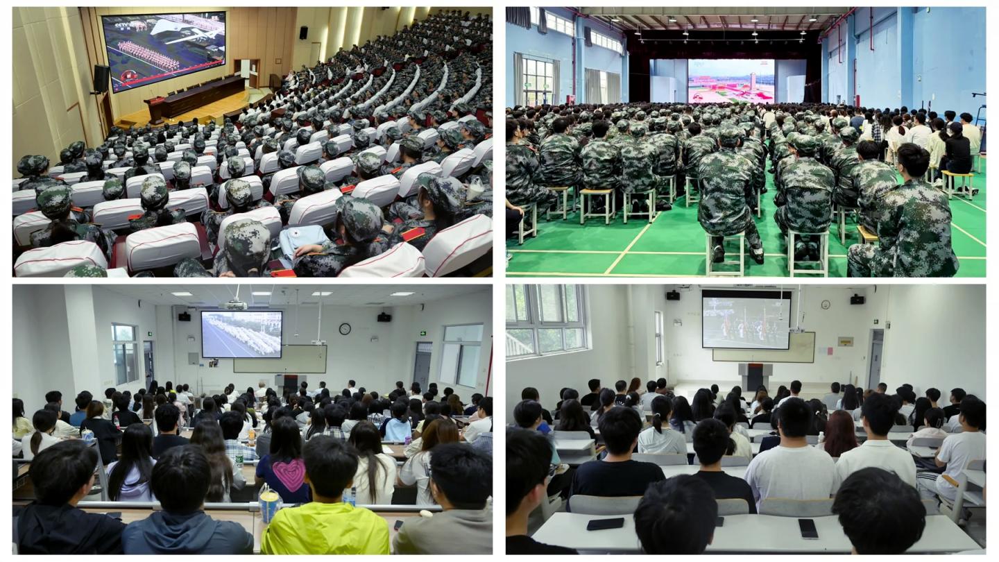 全体在校校领导,各职能部门、各二级学院党政主要负责人以及全校科级以上干部在主会场共同观看大会盛况。2025级新生、辅导员及其他无课师生在各分会场集中收看。大家精神振奋、热情高涨,认真聆听习近平总书记的重要讲话,对阅兵式出场的各类方队和新式武器装备发出连连赞叹,用热烈的掌声表达对祖国深深的祝福。
