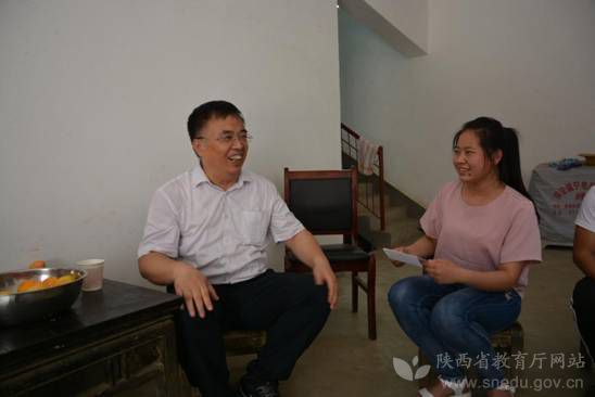 陕西省政府学位委员会秘书长袁宁与建档立卡贫困户学生张永慧交谈并送上慰问金