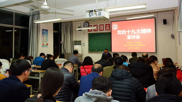 他要求化材学院所有师生结合实际,在今后一段时期内深入学习领会党的十九大精神,并将其作为开展各项工作的重要指引。他强调,学习党的十九大精神要做到真学、真懂、真用,作为教师要通过教学环节使党的十九大精神进课堂、进教案、进学生头脑。他要求每一位党员都要定期参加组织学习和组织生活会,加强政治意识、大局意识、核心意识、看齐意识,在日常教学、科研工作中做出新的贡献。