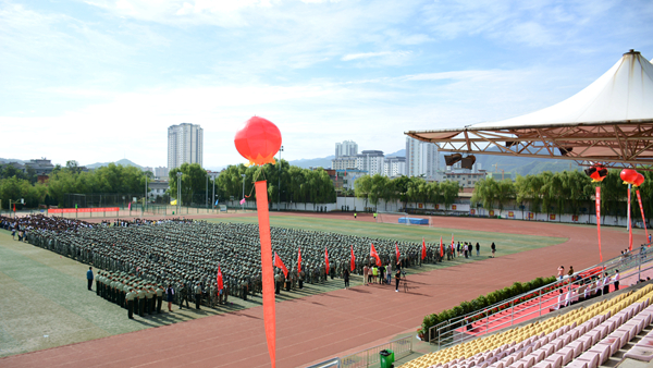 未觉池塘春草梦,阶前梧叶已秋声。9月7日上午,best3652018级学生开学典礼暨军训动员大会在学校体育场隆重举行。校长范新会、纪委书记王思怀、副校长魏书堂、党委副书记彭虎军,副校长刘宝盈、刘勇,武警商洛支队副参谋长、军训团团长吕喆少校,武警商洛支队执勤一大队大队长、军训团副团长郭伟少校,2005届校友、蓝田县汤峪镇高堡初级中学校长吴楠出席大会。各二级学院(部)党政主要负责人、有关职能部门负责人及3500余名2018级新生参加大会。大会由彭虎军主持。