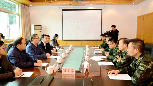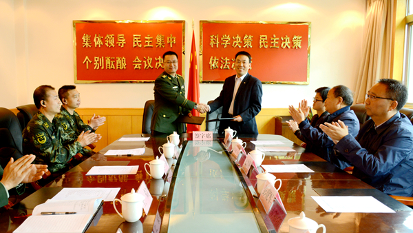 彭虎军代表学校与武警商洛支队签订了合作共建框架协议。与会人员一同参观了武警商洛支队机动中队生活场所,观摩了武警战士军事技能训练。