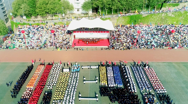 文体表演尾声,全场师生挥舞着手中小红旗,共同唱响《我和我的祖国》,齐声高喊“祖国,我爱你”,把现场气氛推向高潮。