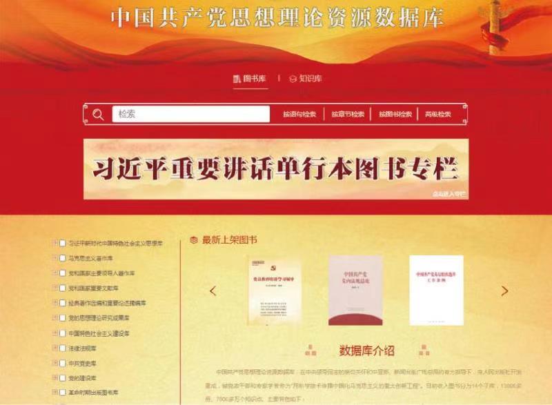 中国共产党思想理论资源数据库,是在中央领导同志的亲切关怀和中宣部、新闻出版广电总局的有力指导下,由人民出版社开发建成,被党政干部和专家学者称为“用科学技术传播中国化马克思主义的重大创新工程”。数据库包含14个子库,收入图书13000余册、涵盖7000多万个知识点,完整系统地收入了党的思想理论主要著作文献,内容覆盖了我国出版的所有马列经典著作、党和国家主要领导人所有著作、公开发表的所有中央文件文献、国家所有法律法规、党的思想理论领域所有知识点。数据库还有代表性地收入了大量研究性著作、党史和国际共运史著作、重要人物资料,以及革命战争年代出版的部分重要图书等。