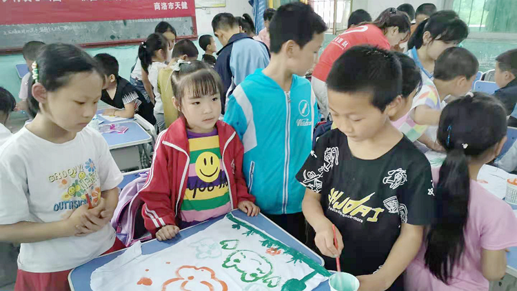 活动中,师生为该校留守儿童赠送了图画本、铅笔、橡皮等绘画用品。向小朋友们展示了校艺术学院学生制作的泥塑、石头画、剪纸拼画、电脑绘画等美术作品,拓展了小朋友们的审美视野,增强了大家的逻辑思维与形象思维能力,激发了大家热爱美、发现美、追求美的热情。师生还进行了“T恤衫彩绘”现场学创实践,用美术实践与T恤衫绘画相结合的教学方式,鼓励和引导小朋友们尝试多样思维和多元表现,进一步增强了大家的实践创作能力。在best365师生一对一、手把手的耐心讲解与悉心指导下,每个小朋友都独立完成了精美的美术作品。