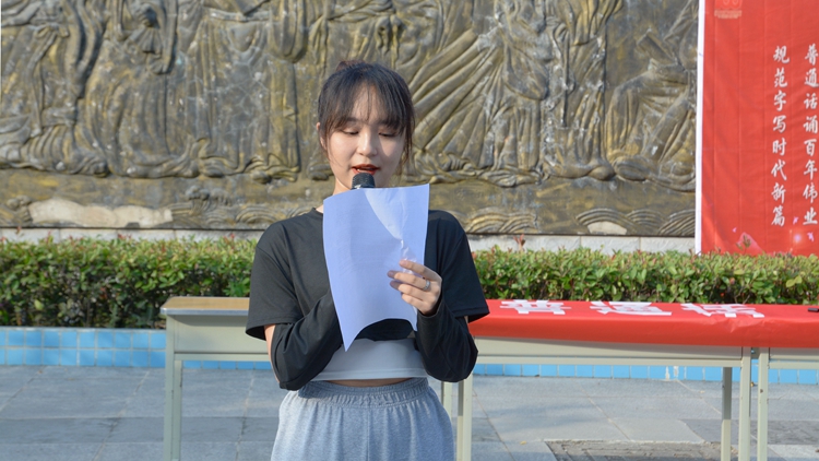 人文学院学生代表王滢在表态发言中呼吁全体学生要规范使用普通话,让规范语言之花开遍美丽的校园。学生朱怡宁、丁欣玉为大家表演了相声《普通话》,通过生动有趣的表演向展示了不良语言习惯及普通话的别样韵味,切实增强了大家的语言规范意识。王林等学生向大家朗诵了红色诗歌《永远跟党走》,带领大家重温了先辈们浴血奋战的革命岁月,让大家在诗歌中感悟党的峥嵘岁月,体会语言的动人魅力。