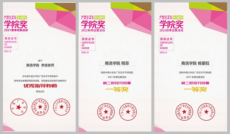 参赛项目立项以来,得到了学校的大力支持,经过广大教师的精心指导及师生的反复修改,艺术学院学生程菲的《啵啵奶茶牙膏》视频类、杨星钰的《元七七表情包设计》表情包设计获得在校本科生一等奖,艺术学院学生李鲁婷的《胖不思饭》短视频、蒋佳翮的《文明传承》短视频、徐健康的《霸王洗发水》平面广告获得二等奖,艺术学院学生穆佳瑶的《听闻》、哈琛的《蓝风铃般的味道》短视频类获得三等奖,薛冰洁、李泽钰的《让安全“看”得见》获得平面广告类优秀奖,谢志鹏、何忠梅等16人的平面广告获得入围奖,艺术学院教师李斌获得“优秀指导教师”奖。