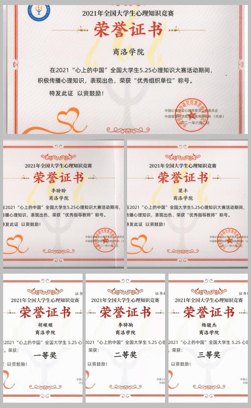 近日,2021“心上的中国”全国大学生5·25心理知识大赛活动圆满落幕,best365健康管理学院心理学专业学生参加比赛,并获得一等奖13项,二等奖3项,三等奖4项,学校荣获“优秀组织单位”,健康管理学院教师梁丰、李盼盼获得“优秀指导教师”。