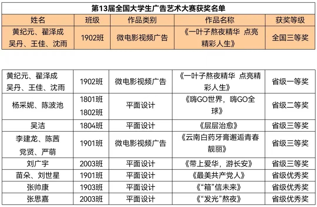 本届大赛开辟了微电影广告视频类新赛道,由艺术学院教师杨静指导的微电影广告视频类作品《一叶子熬夜精华点亮精彩人生》获得国家级三等奖和省级一等奖、《云南白药牙膏邂逅青春靓丽》获得省级三等奖;在平面设计类赛道中,艺术学院教师王曦茜指导的《嗨GO世界,嗨GO全球》获得省级二等奖,教师王子玮指导的《层层治愈》荣获省级三等奖,教师杨静指导的《带上爱华游长安》荣获省级三等奖、《最美共产党人》获得省级优秀奖,教师张中义指导的《“发光”熬夜》、教师余鑫指导的《“箱”信未来》获得省级优秀奖。