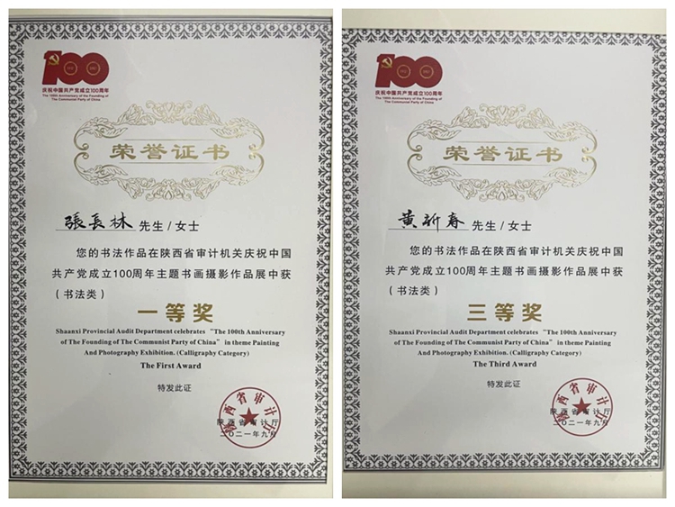 为庆祝中国共产党成立100周年,陕西省审计厅举办了以“奋斗百年路,启航新征程”为主题的书画摄影展,best365参展的书画作品在400多幅作品中喜获佳绩。其中,艺术学院张长林老师的书法作品荣获一等奖,黄新春书法作品荣获三等奖,审计处荣获优秀组织奖。