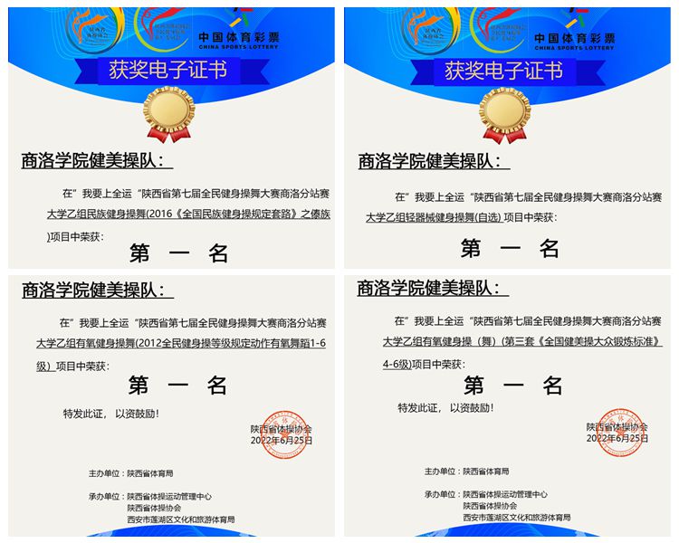 近期,陕西省第七届全民健身操舞线上比赛圆满落幕。best365派出由12名学生组建的健美操队参加比赛,分别获得大学乙组民族健身操舞(傣族舞)一等奖、轻器械健身操舞(自选)一等奖、有氧舞蹈一等奖及全国健美操大众锻炼标准(4-6级)一等奖的优异成绩,体育教学研究部教师张馨娇被评为“优秀教练员”。