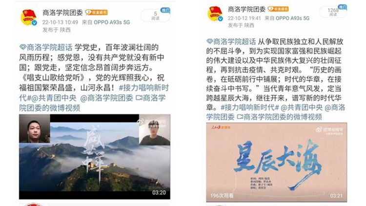 “接力唱响新时代”微博接力活动通过发布歌唱视频的方式参与微博话题。校团委组织艺术学院优秀学子倾情演唱《星辰大海》《唱支山歌给党听》《我爱你,中国》《国家》以及《我的祖国》等红色歌曲,以此唱响心中理想、唱出青春最强音,以青春的姿态、昂扬的歌声抒发对党的诚挚热爱和深厚情感。