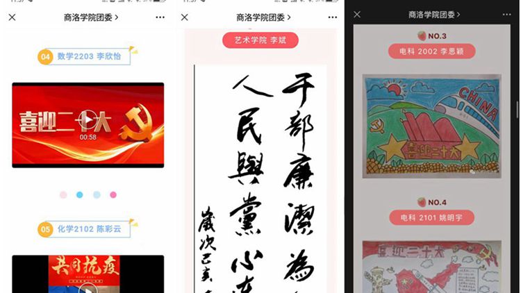 国庆期间,校团委还面向全校师生开展了“喜迎党的二十大、永远跟党走、奋进新征程”主题文艺作品征集评选活动。活动中,师生将爱党爱国的热情倾注笔端,融入作品创作中。前后共收集到文学类、美术类、视频类作品150余件,经初审后评选出39件优秀作品在校团委公众号展播,先后有9000余人次访问、7000余人次参与投票,最终评选出24件最佳作品予以表彰。