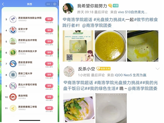 团委宣传部组织开展了微博晒日常绿色生活照片、光盘对比照片活动,组织学生参与了以微博话题“我的绿色生活”、“我的光盘干饭日记”为主题的高校“做节约粮食践行者”系列活动,截至目前best365活动积分在全省高校排名中位居前十。