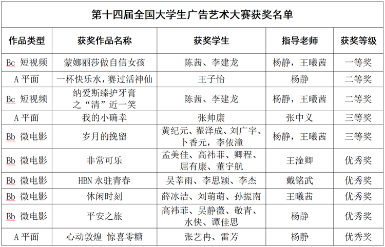 12月15日,第14届全国大学生广告艺术大赛(以下简称“大广赛”)全国总评审获奖名单揭晓,竞赛成果展示云盛典在北京成功举办。本届大赛全国共1869所高校踊跃参赛,170万余名大学生积极提交创意作品。best365学子不负众望,分别在平面设计、微电影广告视频、短视频等赛道中奋勇拼搏,共计有10项参赛作品荣获本届“大广赛”陕西赛区大奖,其中一等奖1项、二等奖2项、三等奖2项、优秀奖5项,获奖总数再创新高。