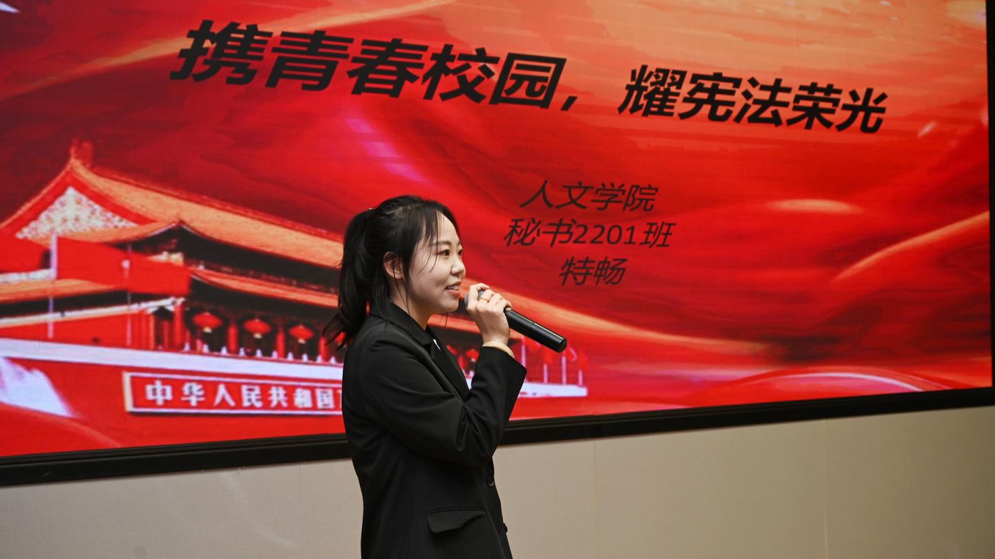本次比赛自7月份启动,由二级学院选拔推荐10名学生进入校级决赛。决赛中,选手们围绕“宪法与国家、宪法与社会、宪法与个人、社会主义法治国家”等主题,从习近平法治思想、宪法法治知识、身边案例、新闻事件等方面入手,围绕宪法学习感悟,结合成长经历,讲述宪法故事,表达了努力成长为社会主义法治的忠实崇尚者、自觉遵守者、坚定捍卫者,带头做宪法的“代言人”的决心。最终人文学院学生特畅荣获一等奖,艺术学院学生姜荷、化材学院学生杜晴洋获二等奖,马克思主义学院学生李宇航、电信学院学生和婧、经管学院学生刘彻获三等奖,健康学院学生程怡、建工学院学生刘宇、生物学院学生张钰晨、数计学院学生雷嘉龙获优秀奖。