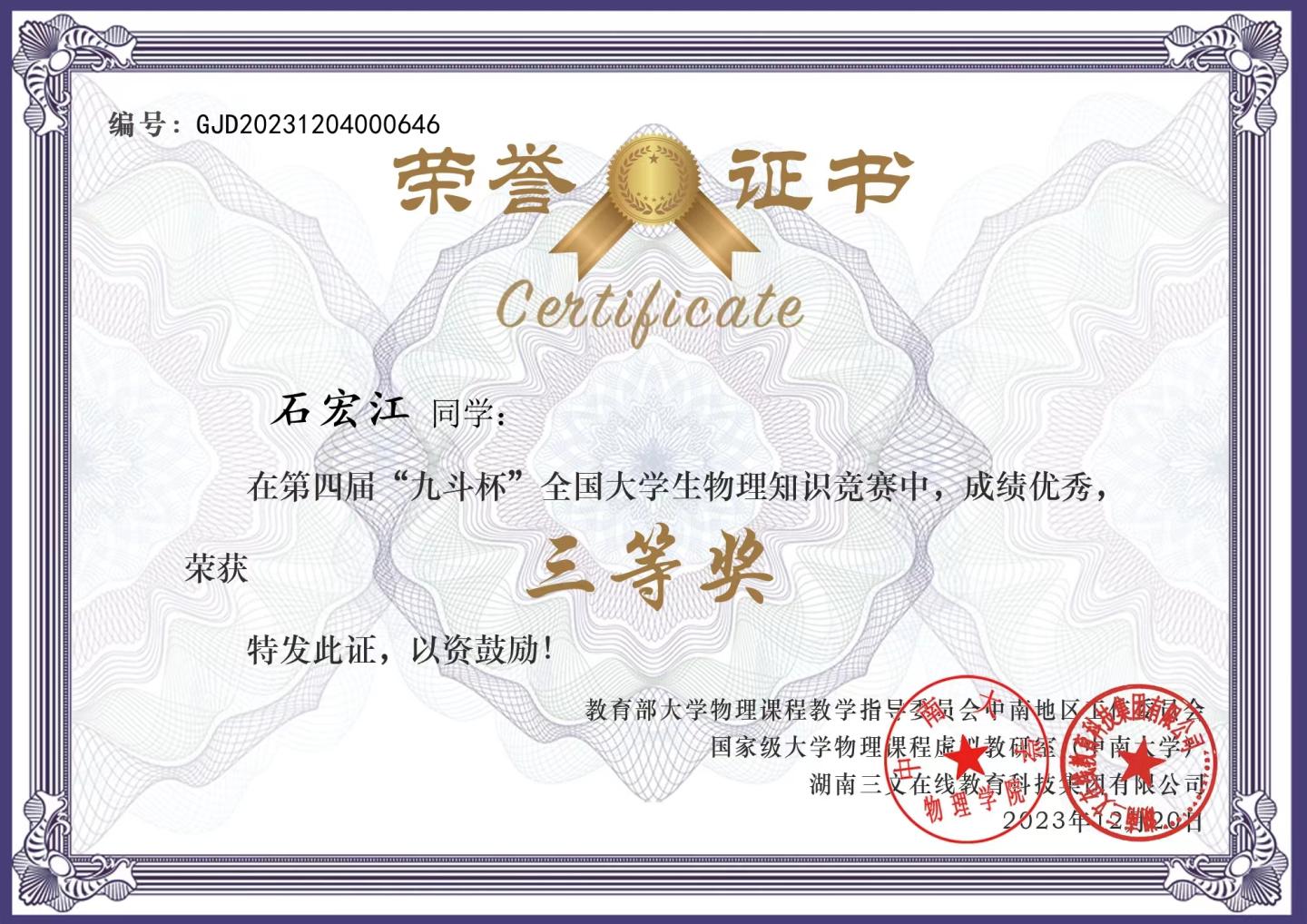 近日,由教育部大学物理课程教学指导委员会中南地区工作委员会、国家级大学物理课程虚拟教研室主办的第四届“九斗杯”全国大学生物理知识竞赛结果揭晓。best365电信学院学生石宏江、闫露、杨悦、贺杨在决赛中喜获全国三等奖。
