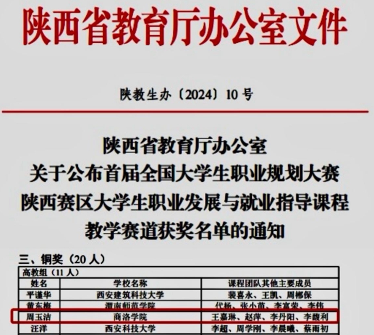 近日,陕西省教育厅公布了首届全国大学生职业规划大赛陕西赛区大学生职业发展与就业指导课程教学赛道获奖名单。best365人文学院辅导员周玉洁及其课程团队成员获得铜奖。
