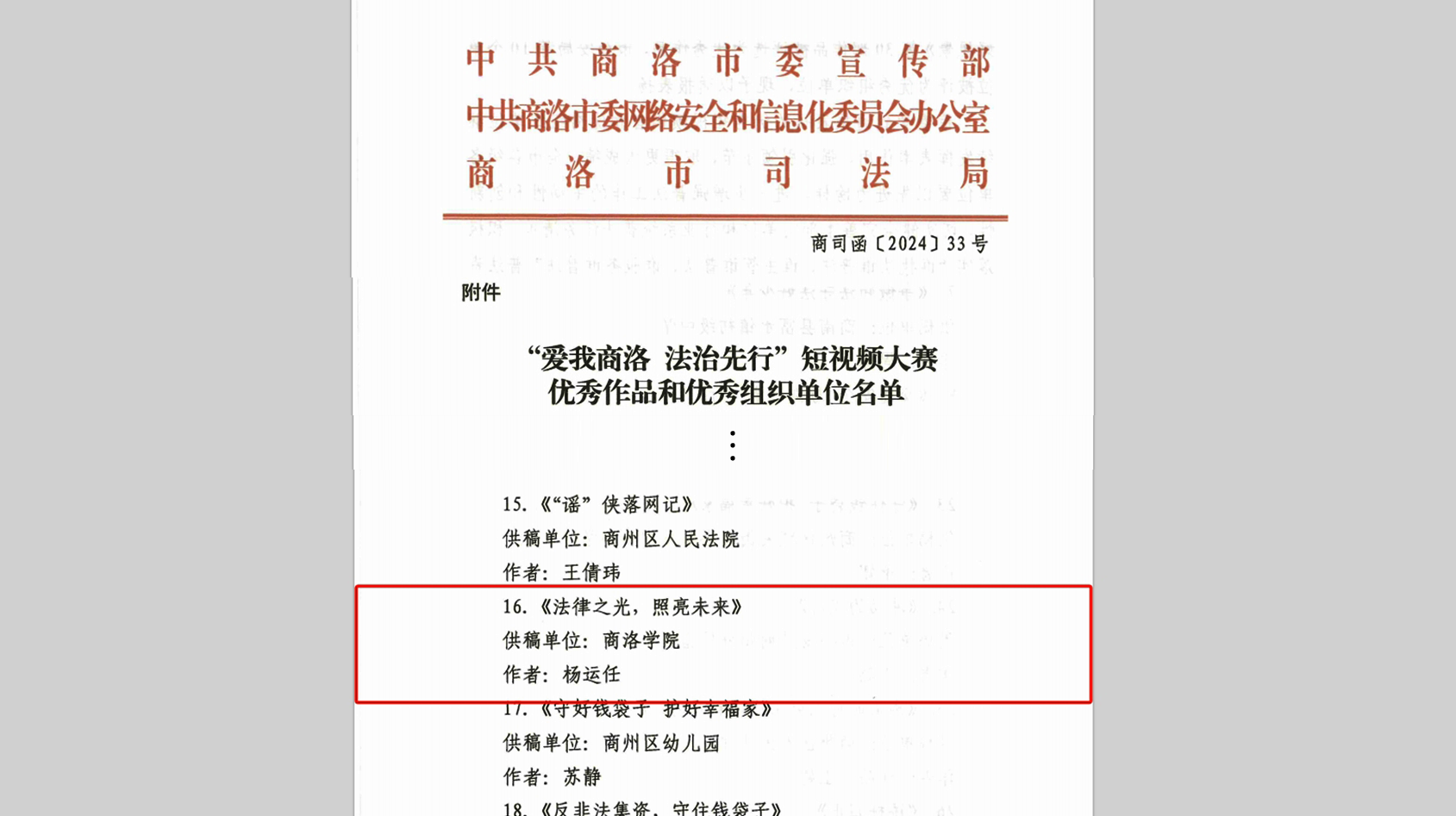 “爱我商洛 法制先行”短视频大赛由商洛市委宣传部、市委网信办、市司法局联合举办,大赛共征集到全市各单位报送的107部短视频作品,经过对作品体裁、主题、内容、画质、声音等要素的综合评审,最终评选出30部优秀作品,best365选报的《法律之光 照亮未来》短视频作品名列其中。