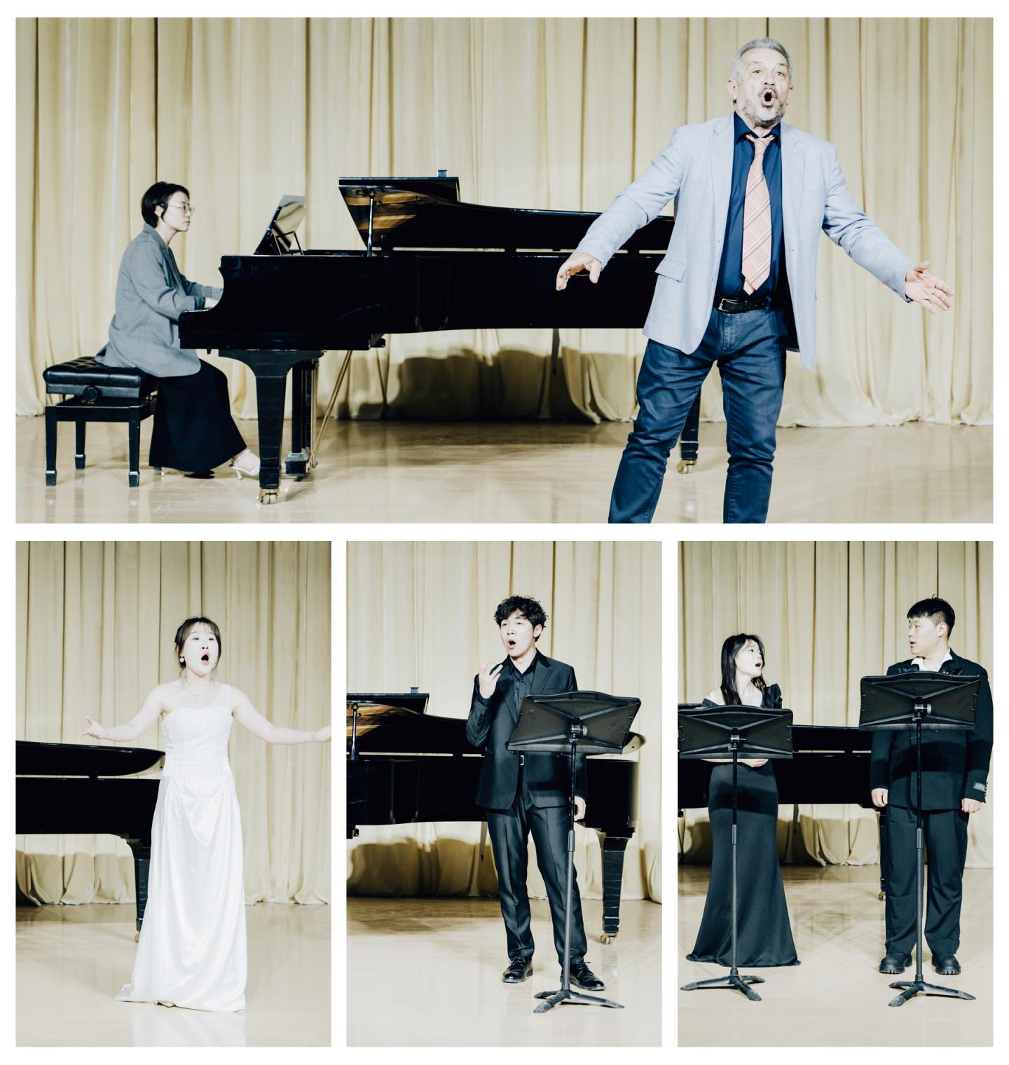 在杰拉尔多·斯皮内利教授声乐教学结课音乐会上,音乐2231霍辰枫等10名同学依次汇报演唱了《偷洒一滴泪》等意大利经典歌曲。斯皮内利教授在师生簇拥下登台,演唱了意大利名曲《像天使一样美丽》,将音乐会气氛推向高潮,现场掌声不断。