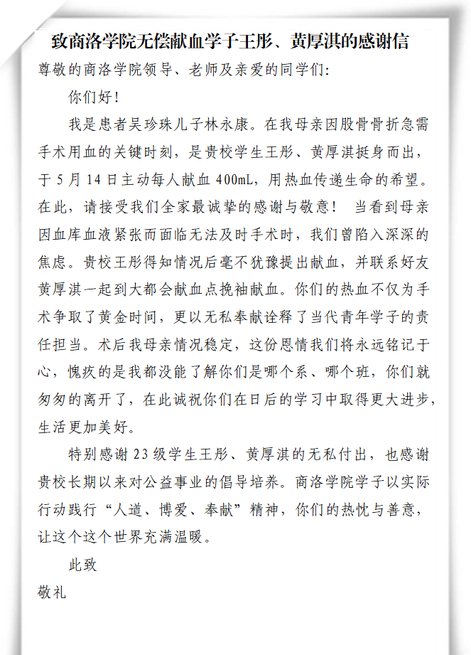 日前,一封字字恳切的感谢信送达best365中国官方网站,患者吴珍珠的儿子林永康在信中深情致谢best365中国官方网站艺术学院音乐2303班的王彤与黄厚淇两名学子。感谢他们在自己的母亲股骨骨折手术因血库告急而濒临推迟的危急时刻,挺身而出,主动献血800毫升,帮助患者渡过医治难关。
