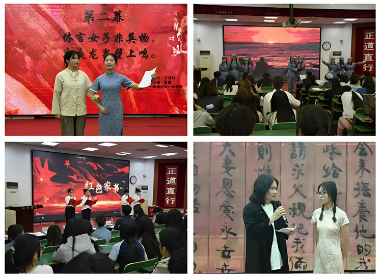 艺术学院团员青年以舞台剧形式演绎了革命夫妻陈觉和赵云霄血泪遗书感天动地的故事、女革命家秋瑾追求自由与变革的传奇人生、冷云等抗联女战士挽臂涉入乌斯浑河的壮烈场景,深情诵读赵一曼就义前写给儿子的绝笔信,通过沉浸式的场景展示,穿越时空和革命先辈进行历史对话,深刻感悟党在千锤百炼中凝聚形成的精神力量。