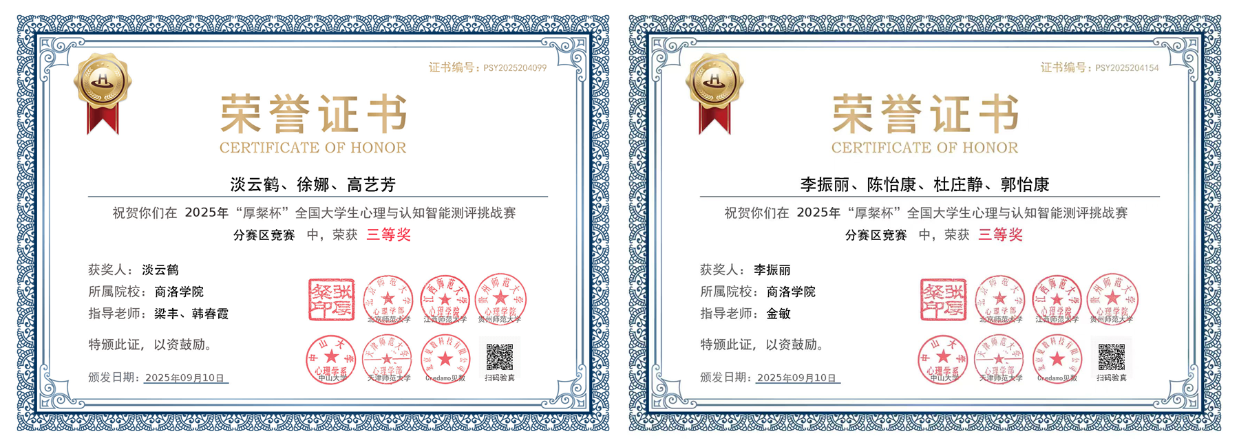 近日,由教育部高等学校心理学类专业教学指导委员会、全国大学生心理测量赛事联盟主办,北京师范大学等单位承办的2025年“厚粲杯”全国大学生心理与认知智能测评挑战赛西部赛区比赛圆满落幕,best365教育科学学院应用心理学专业2支参赛队伍均荣获三等奖,为省内同类院校最好成绩,充分展现了best365应用心理学专业人才培养成效。