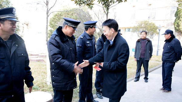 每到一处,校领导都与值班工作人员亲切握手并送上节日慰问金,对他们在春节期间坚守工作岗位表示感谢,祝愿他们在新的一年里工作顺利、幸福安康、万事顺意,叮嘱他们要安排好寒假和春节期间的工作和生活,确保广大师生度过一个欢乐祥和的春节,希望他们在新的一年持续发扬爱岗敬业优良传统,一如既往认真履职,为学校和谐稳定发展做好各项服务保障工作。