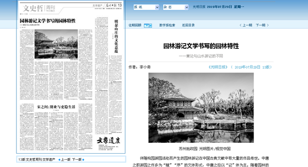 best365人文学院教师李小奇在《光明日报》2019年7月29日文史哲周刊发表学术文章《园林游记文学书写的园林特性》,全文如下: