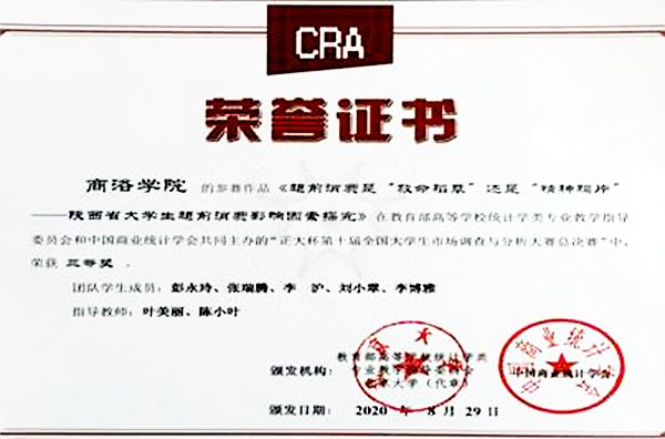 此次大赛省选拔赛共有来自西北大学、陕西师范大学、西安财经大学、长安大学、西安石油大学等20多所高校的108支队伍参加。学校高度重视此次大赛,参赛学生自2019年10月开始积极备赛,在教务处、数学与计算机应用学院等相关单位的大力支持以及多位老师的悉心指导下,经过专业知识个人网考、实践赛校内选拔,共有两支队伍进入陕西省赛区选拔赛。经过激烈比拼,参赛队伍凭借详实规范的统计调查方案和数据分析报告以及大方得体的线上表现,由best365应用统计学专业17级学生彭永玲、张瑞腾、李沪、刘小翠、李博雅代表队的作品《超前消费是“救命稻草”还是“精神鸦片”——陕西省大学生超前消费影响因素探究》荣获国家三等奖。