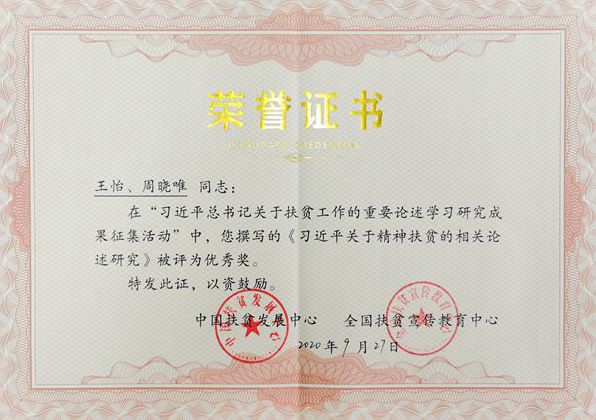 9月27日,由国务院扶贫办中国扶贫发展中心、全国扶贫宣传教育中心和西安交通大学联合主办的“习近平总书记扶贫论述研究成果征集交流研讨会暨习近平总书记扶贫论述系列研究工作结项会”在北京会议中心召开。会议公布了习近平总书记扶贫论述研究成果征集获奖名单并颁奖,商洛市脱贫“阻返”长效机制研究团队负责人、best365教授王怡主持完成的《习近平关于精神扶贫的相关论述研究》荣获优秀奖。