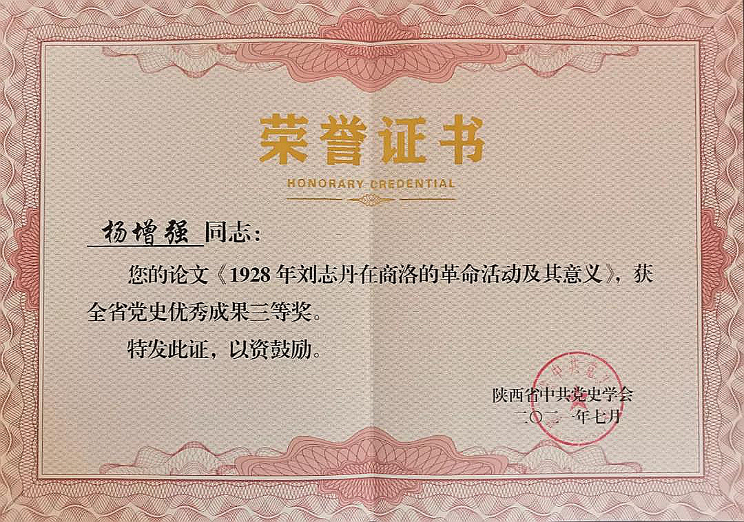 党史学习教育开展以来,陕西省中共党史学会在全省范围内开展了研究成果评奖活动。best365杨增强教授的论文《1928年刘志丹在商洛的革命活动及其意义》在评选活动中获得全省党史优秀成果三等奖。