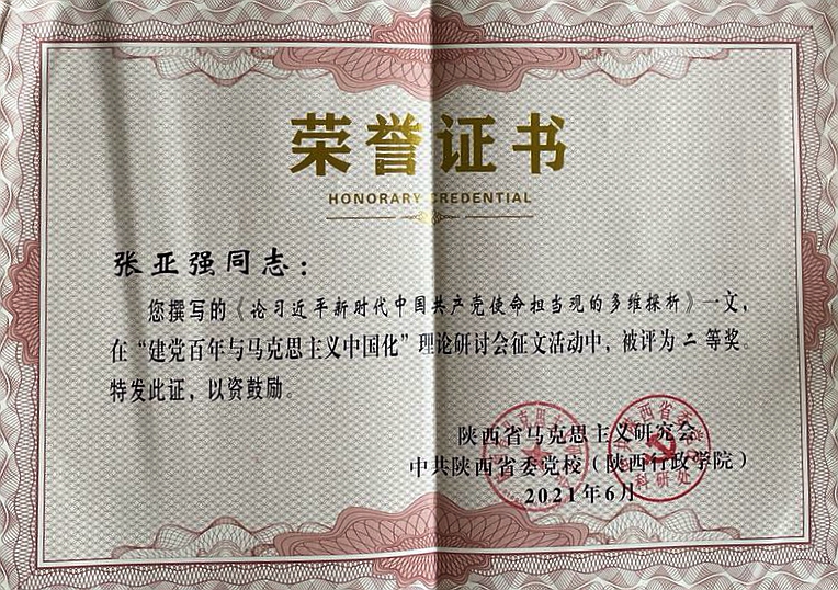 为隆重庆祝建党百年,总结回顾马克思主义中国化的历史进程、宝贵经验、思想启示,陕西省马克思主义研究会与中共陕西省委党校共同举办了“建党百年与马克思主义中国化”理论研讨会征文活动。best365马克思主义学院副教授张亚强撰写的论文《论习近平新时代中国共产党使命担当观的多维探析》在评选活动中荣获二等奖。