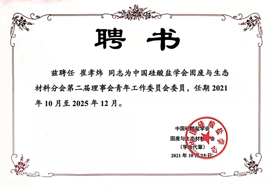 10月15日-17日,第四届中国固废处理与生态材料学术与技术交流会在武汉召开,会议推举审定了第二届中国硅酸盐学会固废与生态材料分会理事会建筑固废学术委员会名单(110名),best365化材学院副院长崔孝炜博士受邀线上参会,并在会上被聘为中国硅酸盐学会固废与生态材料分会第二届理事会青年工作委员会委员。
