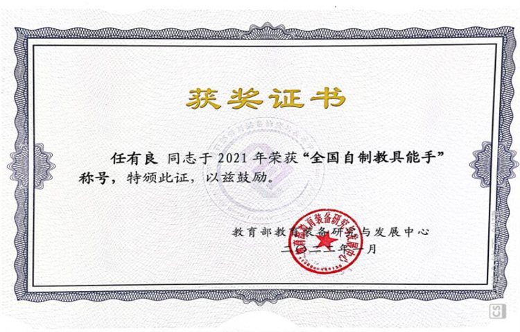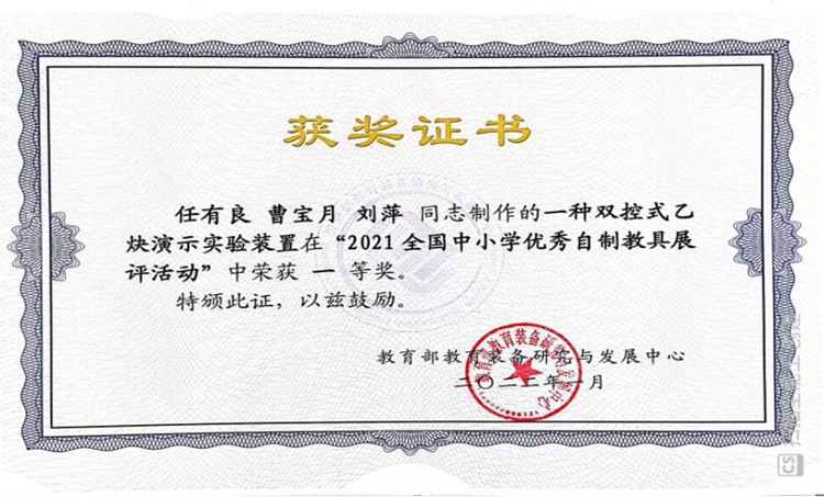 近日,教育部教育装备研究与发展中心举办了“2021全国中小学优秀自制教具展评活动”,best365化学工程与现代材料学院教师任有良、曹宝月、刘萍的参展作品“一种双控式乙炔演示实验装置”获全国一等奖,任有良获“全国自制教具能手”称号。
