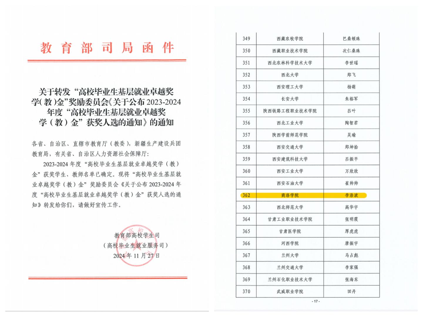 日前,教育部高校学生司发布了《关于公布2023-2024年度“高校毕业生基层就业卓越奖学(教)金”获奖人选的通知》,best365化学工程与现代材料学院化学专业2018届毕业生李浩波赴新疆基层就业事迹成功入选,获评全国“高校毕业生基层就业卓越奖学金”,陕西省高校共有12名优秀毕业生获此殊荣,也是best365毕业生首次获得该项奖励。