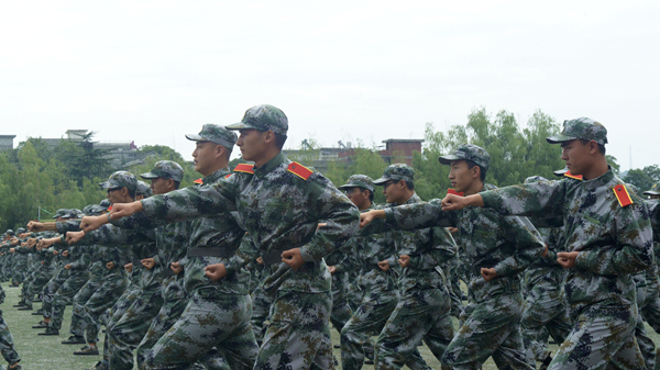 分列式结束后,学生依次进行了匕首操、五步拳汇报表演。女兵们表演的匕首操动作铿锵有力、一气呵成,尽显“铿锵玫瑰”风姿。全体参训学生共同完成的五步拳表演,出拳虎虎生风、刚劲有力,每一个动作都干净利落,挥舞间游刃有余,博得大家的阵阵喝彩。