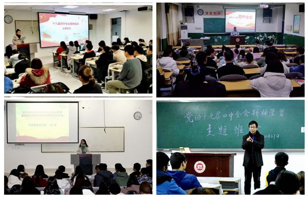 为确保党的第十九届四中全会精神全覆盖,各学院针对外出实习学生,借助微信、qq工作群等网络平台,发送学习内容,开展了多种形式的在线学习。
