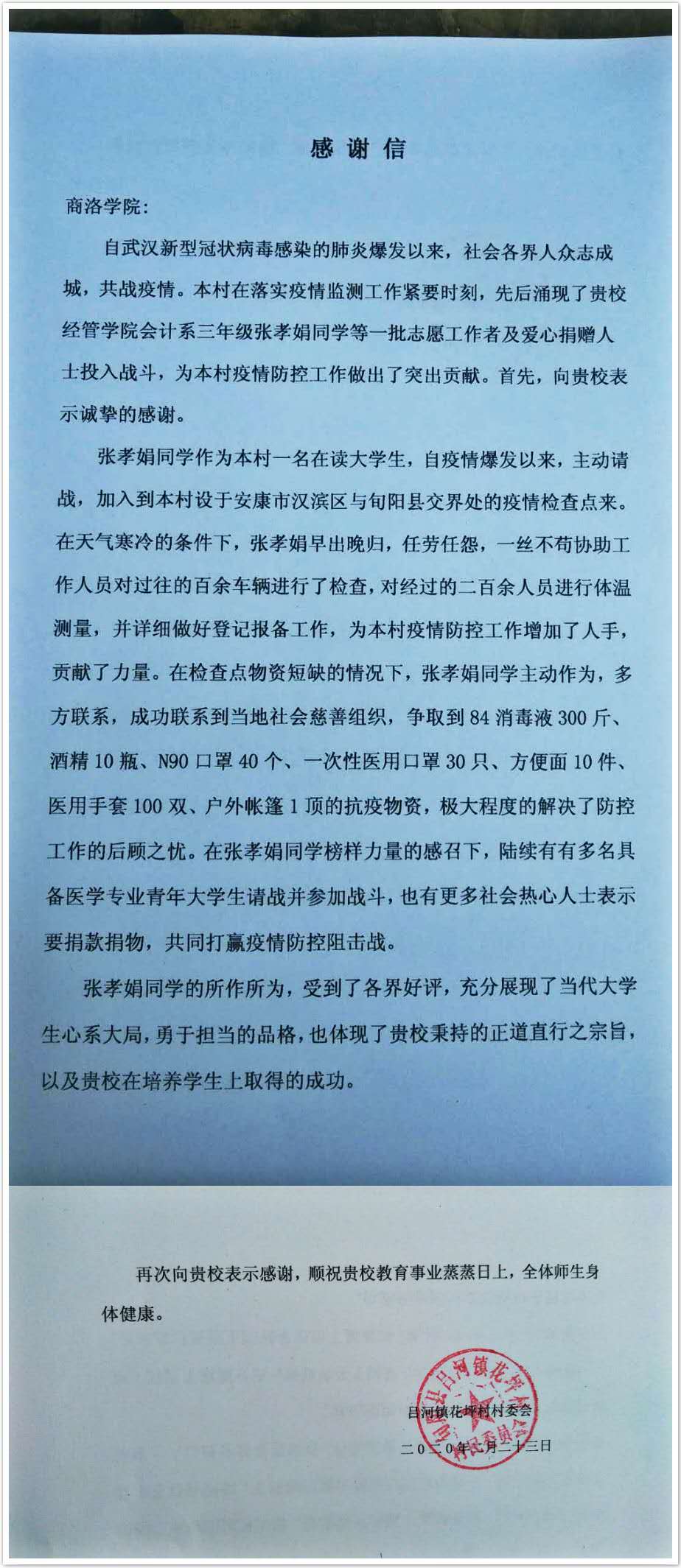 张孝娟同学的事迹受到乡镇领导、公安民警、村委会书记等人的一致好评,为对张孝娟同学本人以及best365中国官方网站致谢,吕河镇花坪村村委会专门向best365发来了感谢信。