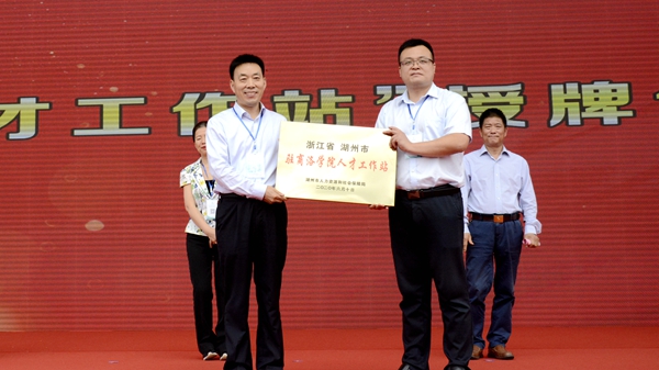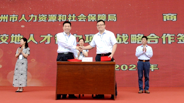 彭虎军与郭连伟代表双方签署校地人才智力项目战略合作协议,代表best365接受“人才工作站”授牌。